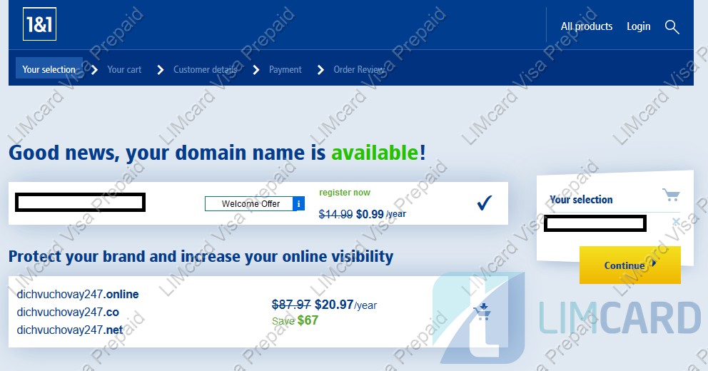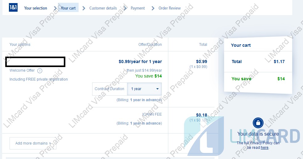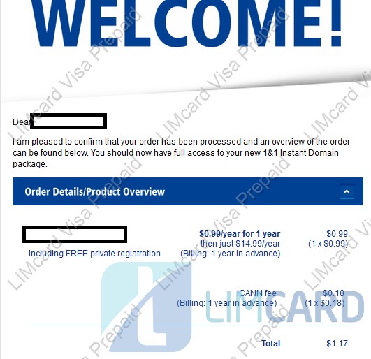 Hi, in this topic, LIMcard will show you how to register a domain at www.1and1.com services with latest offer, just $1 for a dot com domain.