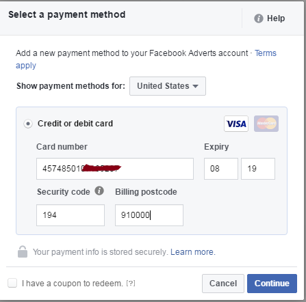 When it comes to adding your card information to your facebook account, please fill in the information as belows.